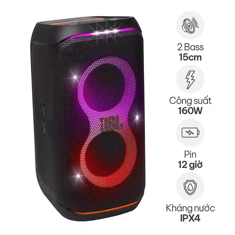 JBL PartyBox Club 120 sẽ biến mọi không gian thành bữa tiệc bùng nổ, đầy cảm hứng. Chất âm JBL Pro Sound mạnh mẽ lan tỏa khắp mọi ngóc ngách, kết hợp cùng màn trình diễn ánh sáng mê hoặc với hiệu ứng đầy sao độc đáo, hiệu ứng dải đèn ánh sáng vòm đua táo bạo, đèn strobe, chớp nháy đồng bộ theo nhịp điệu âm thanh. Ghép nối tức thời bất kỳ thiết bị Bluetooth nào và hòa điệu theo playlist nhạc yêu thích của bạn, hay sử dụng đầu vào mic và guitar để chia sẻ âm nhạc của riêng bạn. Bất kể theo cách nào, bạn đều có thể làm chủ không khí bữa tiệc với các hiệu ứng tiệc tùng tương tác thú vị bằng ứng dụng JBL PartyBox. Tay cầm linh hoạt gập mở dễ dàng mang PartyBox Club 120 đến mọi nơi, cấu tạo kháng nước khiến loa phát nhạc thoải mái, bất chấp những cơn mưa rào. Khuấy động không gian tiệc đến 12 giờ - tiệc tùng không lỡ nhịp khi, chỉ cần thay pin sạc dễ dàng, để "ngọn lửa" âm thanh và ánh sáng tiếp tục tuôn trào. Để khuấy động không khí bữa tiệc bùng nổ hơn nữa, ghép nối stereo hai loa JBL PartyBox Club 120 tạo hiệu ứng âm thanh rộng khắp, hoặc sử dụng ứng dụng JBL PartyBox để ghép nối không dây nhiều loa JBL có hỗ trợ Auracast. Khơi không khí tiệc sôi động hết mức cùng JBL PartyBox Club 120.